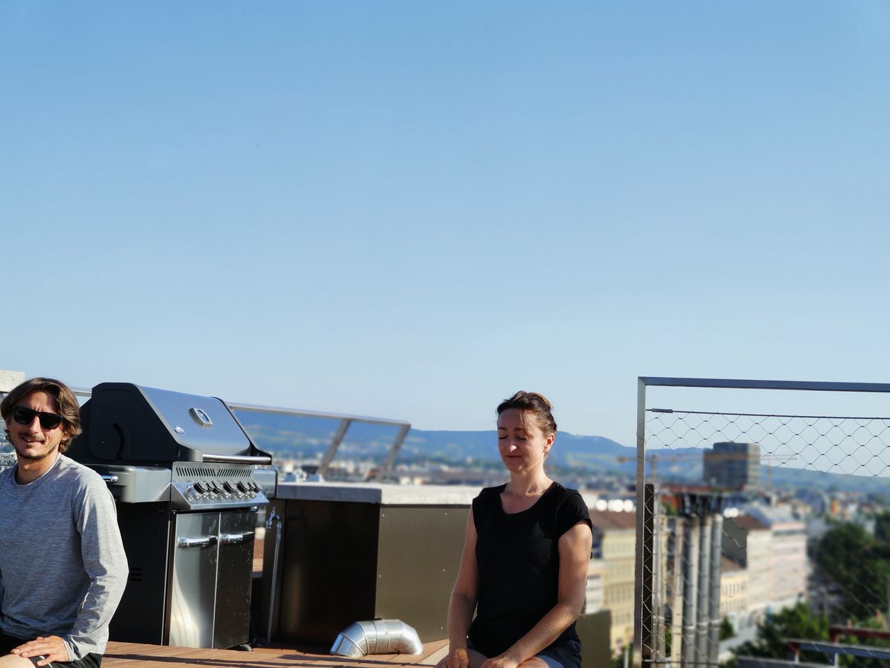 über den besuch von jacqueline, einer ehemaligen kollegin, haben wir uns sehr gefreut, damit wir mit ihr eine yogastunde auf unserer dachterrasse durchführen konnten